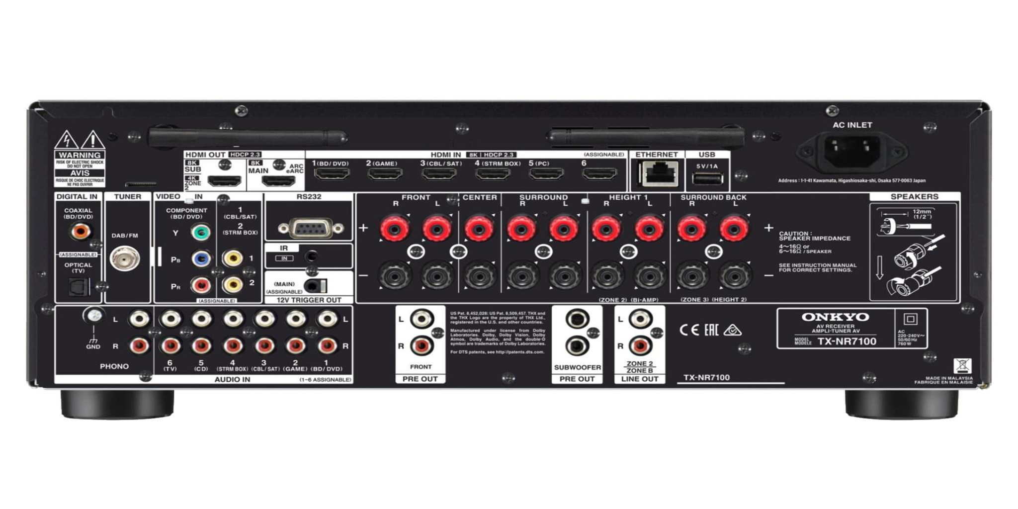 7 wejść HDMI (jedno z przodu) i 2 wyjścia (Main Out [eARC], Sub/Zone 2 Out)